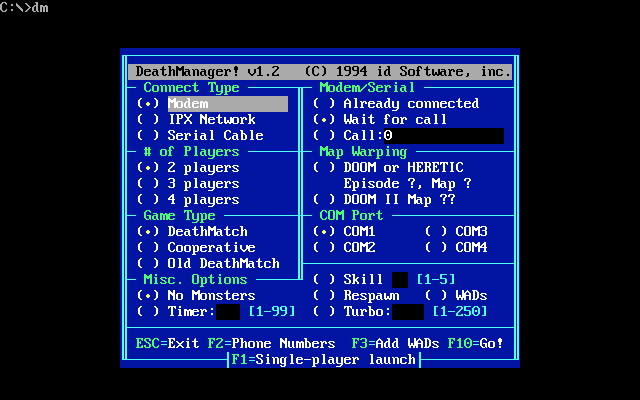 dm.exe was a quaint little frontend that made launching multiplayer DooM games easier (or at all possible? It was so long ago, none now live who remember it). Its UI was all ASCII, and the fact that setting up multiplayer games had to be done with this extremely janky looking little tool drove home just how much multiplayer wasn’t the point. There were no multiplayer specific maps (unless you count DooM II’s map 7, Dead Simple, which was pretty much all we ever played in LAN), no specific rulesets other than “spawn in and kill everyone and everything”, there were no leaderboards, no win conditions, and you just played until you were done playing (or until someone else arrived with their PC, needing to interrupt the BNC ring network, which would refuse to work again for the next hour or so).